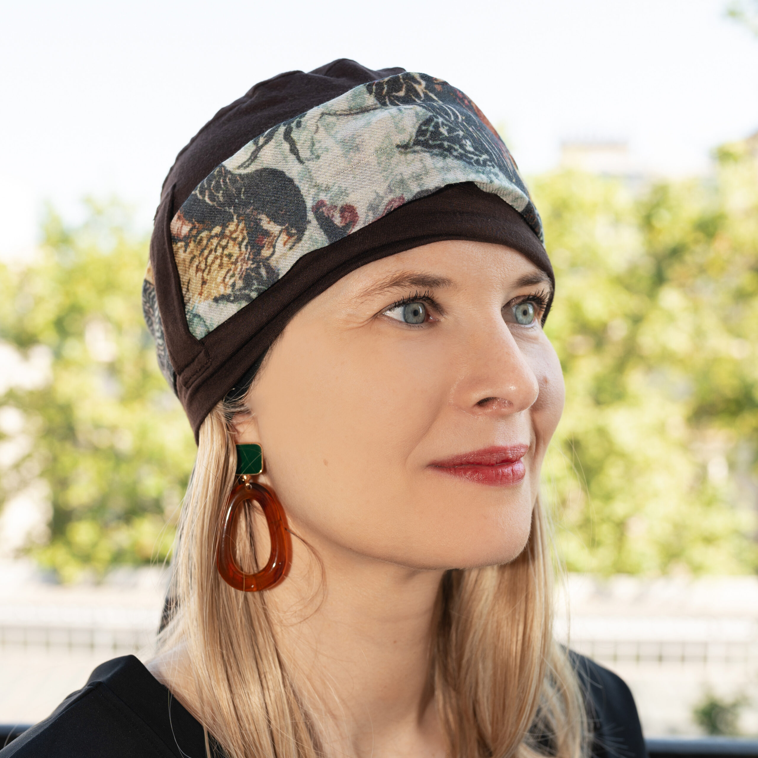 Laissez-vous séduire par Leïla, qui allie confort, via son bonnet en jersey de bambou, et un foulard seventies amovible en modal.